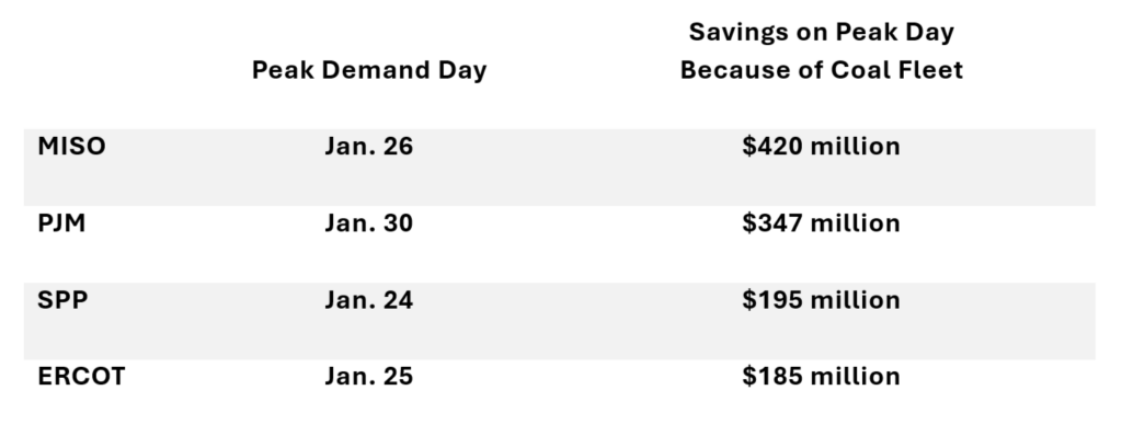 The increase in power prices without coal totaled almost $1.15 billion for all four regions on the day Fern peaked. Put another way, the savings from having coal as part of the generation mix totaled almost $1.15 billion on the day the storm peaked. Note that these savings are for a single day, not the entire duration of Fern which lasted several days. For that and other reasons, these estimated savings are conservative. (The EVA report explains these reasons.) The table below shows the savings for each region.