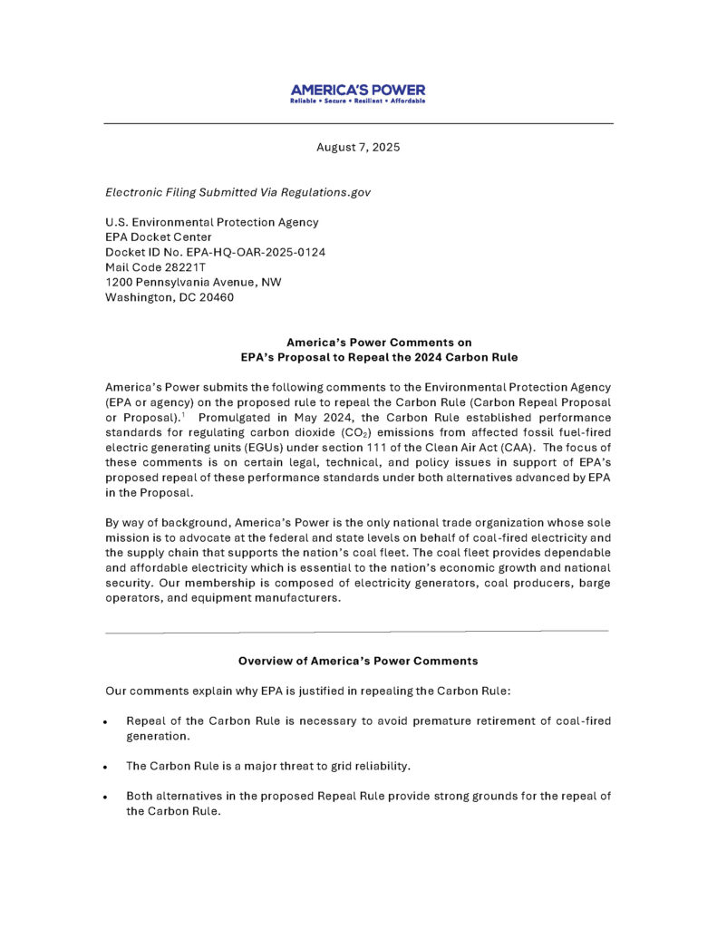 America’s Power Comments on EPA’s Proposal to Repeal the 2024 Carbon Rule